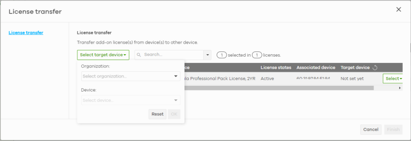 6 Click Select target device to transfer all licenses to one Nebula Device by selecting the same or different Organization and target Device. Then click OK. Or select the devices individually.