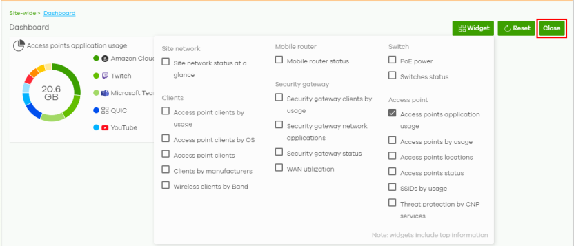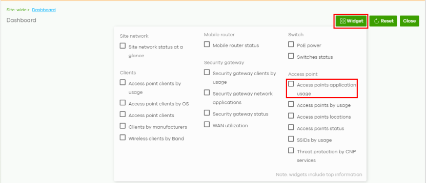 2 Click Widget to filter the list of widgets to display on the Dashboard screen and select Access points application usage.