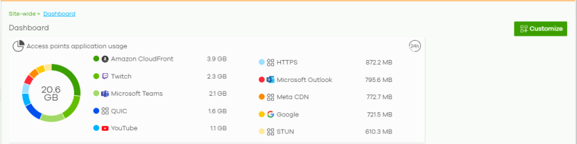 The Access points application usage widget appears. This allows you to view the top ten applications used by the Nebula access points in the site in the past 24 hours.