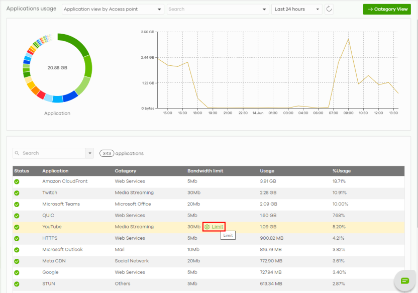 4 Go to Site-wide > Applications usage to view the usage statistics for applications used in the site. Hover the mouse on the application (for example, YouTube) you wish to limit the bandwidth and click Limit.