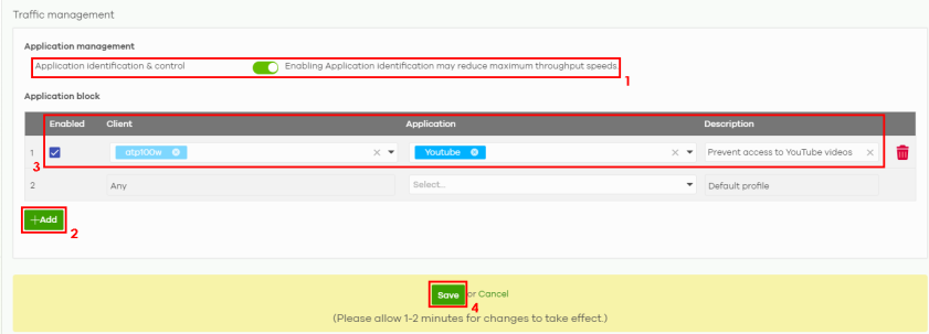 • Select the Enabled checkbox to turn on the rule. Select the Client to which this rule applies. Select the YouTube Application to apply the rule. Then enter a Description for this profile (up to 512 characters long).