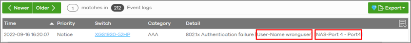 • User submits an incorrect 802.1X credential (wrong user name on the client port ‘Port4’).