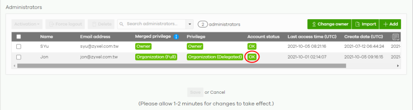The Account status field will show OK after saving. The new administrator will receive an email notification.