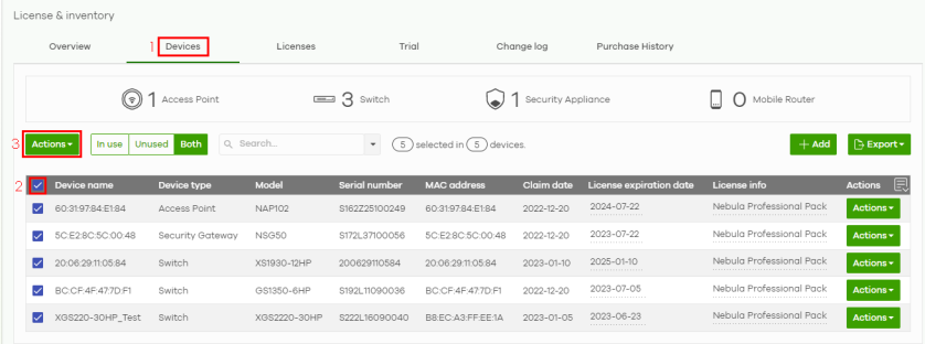 1 Go to Organization-wide > License & inventory > Devices tab (1).