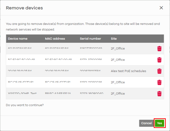 5 Click the Yes button to confirm, or click the delete icon to remove each devices individually.