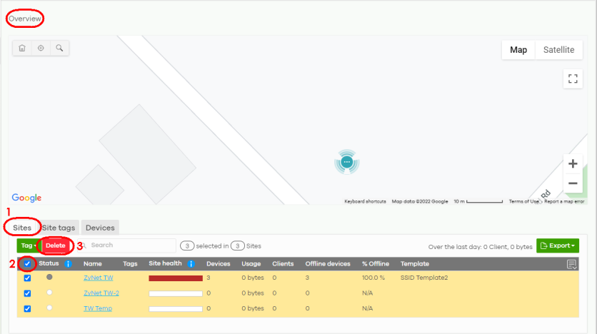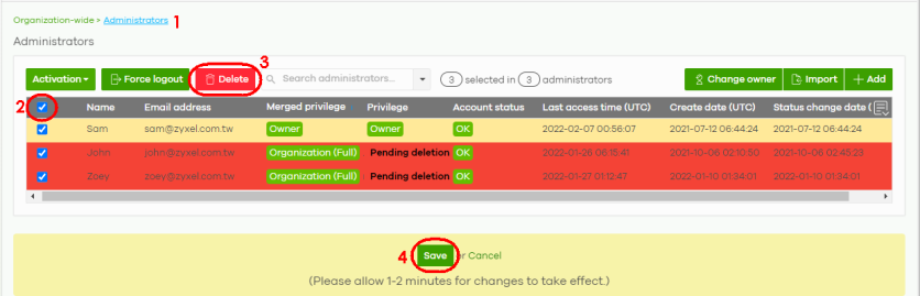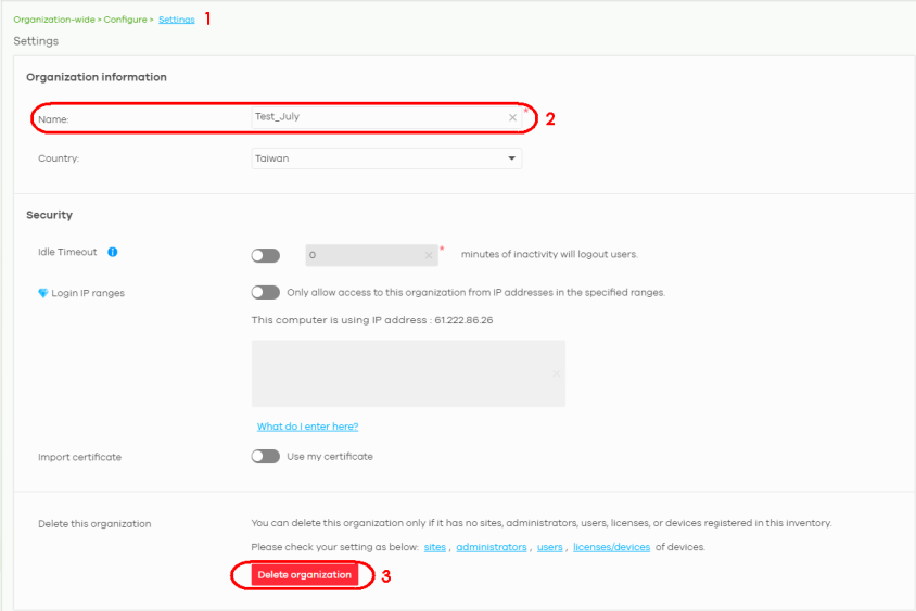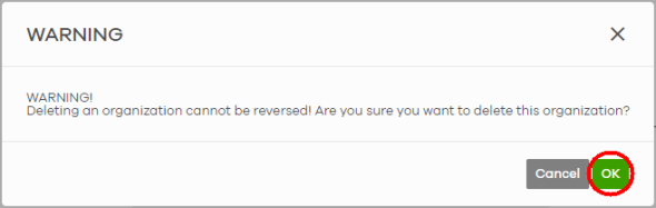 Only the Organization owner can delete an Organization. An Organization can be deleted only when it has no site(s), administrator(s), user(s), license(s), or Nebula Device(s) in the Organization.