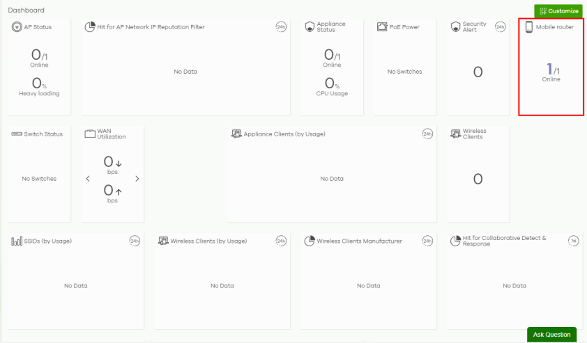 1 Go to Site-wide > Dashboard. 1/1 Online will show in Mobile router. This means that one Nebula Device (mobile router) is registered in Nebula and is online.