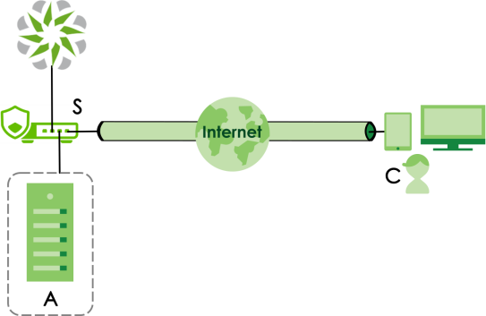 The following figure illustrates a secure VPN channel configured through NCC. The VPN client (C) remotely accesses the office server (A) through the Nebula Device (S) in a typical work from home scenario.