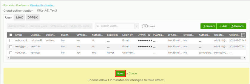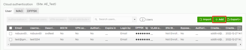 1 Go to the Site-wide > Configure > Cloud authentication screen. Click +Add to create a user.