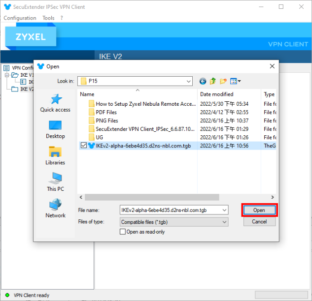 4 Locate in your computer and click Open to import the VPN configuration file from the Configuration for SecuExtender IPSec VPN Client email.