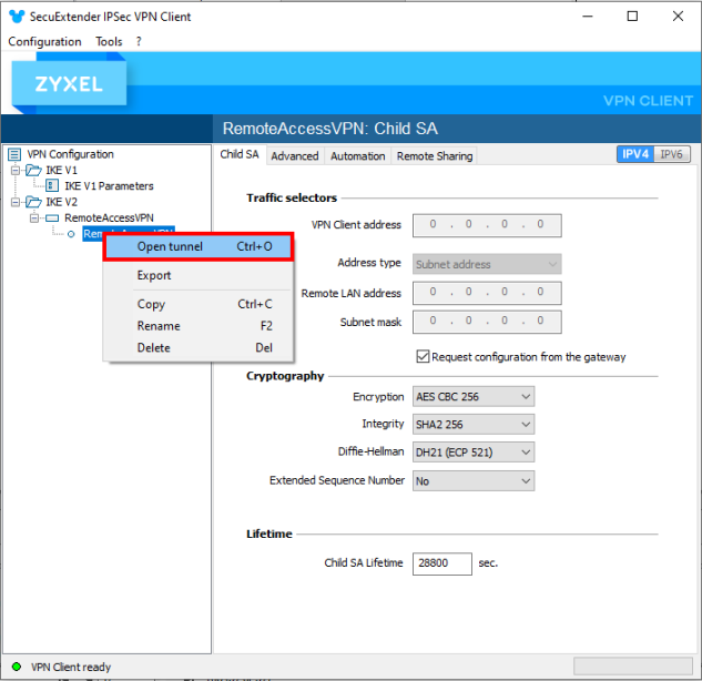 1 Right-click RemoteAccessVPN in VPN Configuration > IKE V2 > RemoteAccessVPN and click Open tunnel.