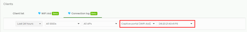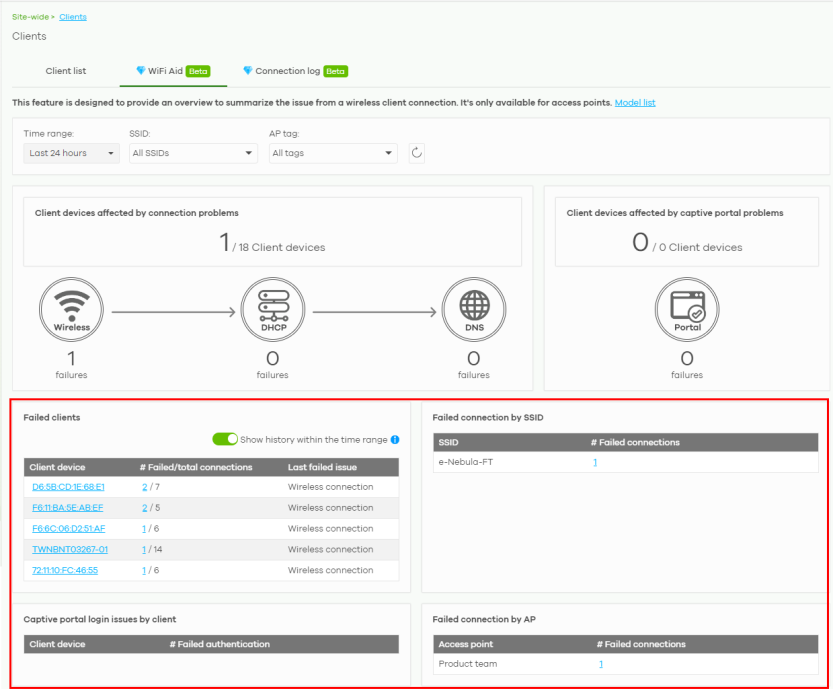The WiFi Aid tab in Site-wide > Clients helps you identify connection problems between WiFi clients and supported AP(s) for a selected time range.