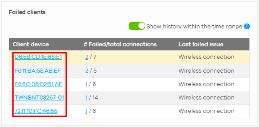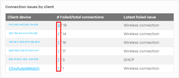 This table displays the number of WiFi clients with failed connection attempts (WiFi connection/DHCP failures/DNS failures) and the number of total connection attempts. The list displays the WiFi client with the most connection failures first, in descending order.