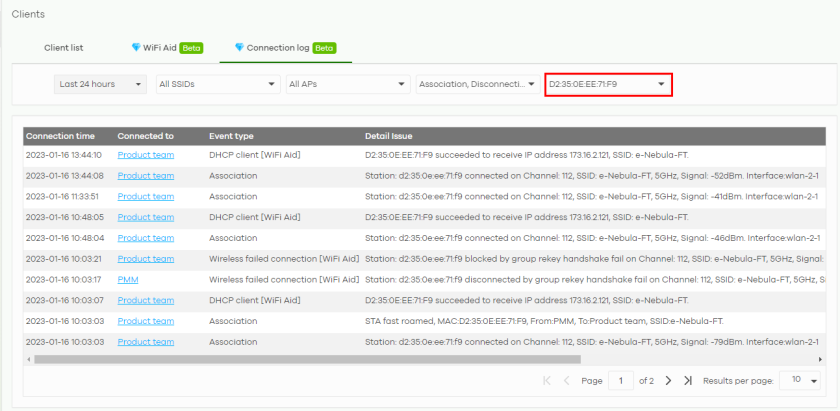 Connection log screen appears showing all related event logs between a specific AP (for example, Product team) and its WiFi clients. See