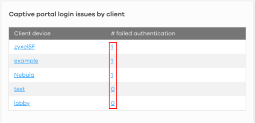 This table displays the list of WiFi clients with the corresponding number of failed connection to the Nebula Device acting as a hotspot. The list displays the WiFi client that could not connect to the Nebula Device acting as a hotspot the most number of times first, in descending order.
