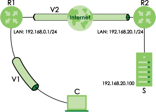 The following example figure shows a VPN client (C) connecting to a Nebula Device (R1) through an L2TP VPN (V1). Nebula Device (R1) connects to Nebula Device (R2) using site-to-site VPN (V2). The VPN client (C) can access a server (S) inside the Nebula Device (R2) through the two VPN tunnels (V1, V2).