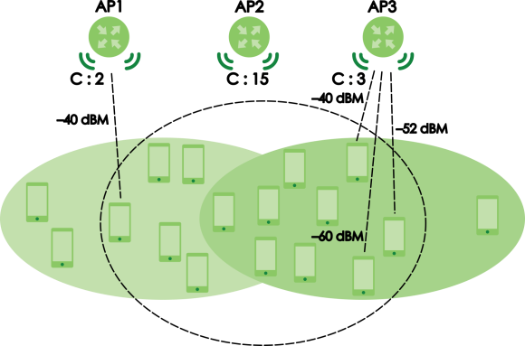 • Signal strength – WiFi client devices that have the weakest signal strength will be disassociated first.