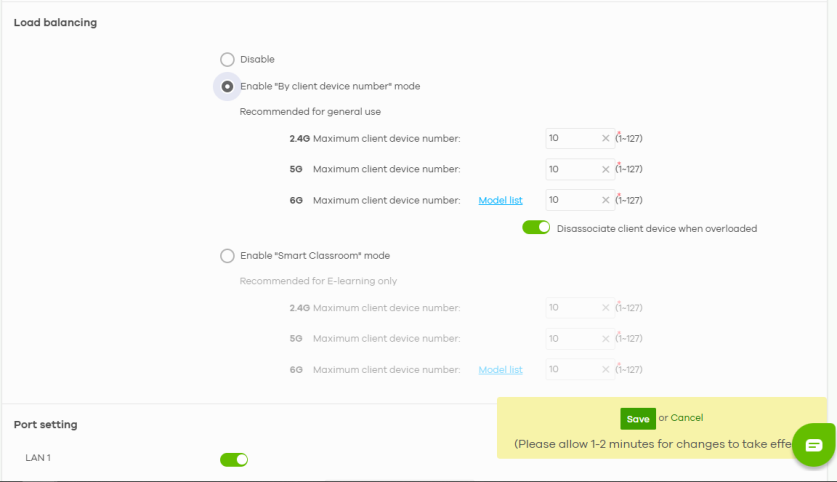 2 Set the Maximum client device number threshold (up to 127) when load balancing will be triggered for each bandwidth (2.4 GHz, 5 GHz and 6 GHz).