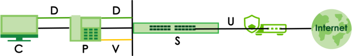 The Nebula Device will add a VLAN tag for voice packets (V) and data packets (D) separately after receiving them. Then forward the voice packets (V) and data packets (D) to the uplink port (U). This section shows you how to separate data packets (D) and voice packets (V) between a VoIP device (P) and computer (C), without having to assign a VLAN tag.