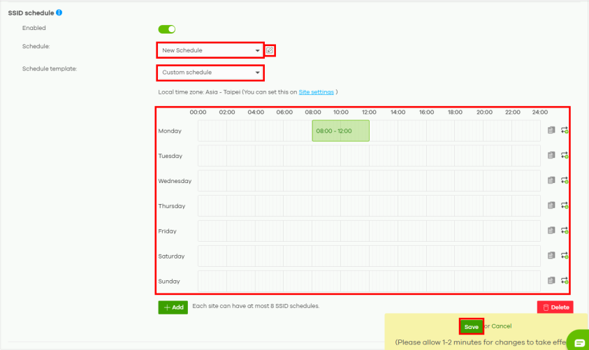 day and time at which the WiFi network (SSID) is enabled. Specify the hour and minute when the schedule begins and ends each day. Then click