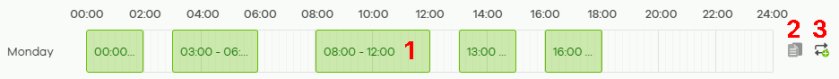 For example, to enable the SSID on Monday: 08:00 to 12:00, click the 08:00 to 10:00 block and drag the right corner to include the 10:00 to 12:00 block (1). Click the Copy icon (2) to copy Monday’s schedule by selecting the day(s) of the week on the Copy schedule to window that appears. Click Apply to confirm.