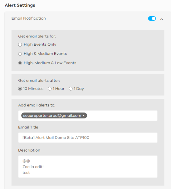 Get email alerts for | Select the severity levels of the security events for which you wish to send out email notifications. • High Events Only – Events that are exceptionally harmful, such as attacks by viruses or a high frequency of attacks. • High & Medium Events – Events that are exceptionally harmful, and events that usually have no adverse effect on a network or a low frequency of attacks. • High, Medium & Low Events – Events that are exceptionally harmful, events that usually have no adverse effect on a network, and events that could collect users’ personal information or adversely affect the network or a medium frequency of attacks. |