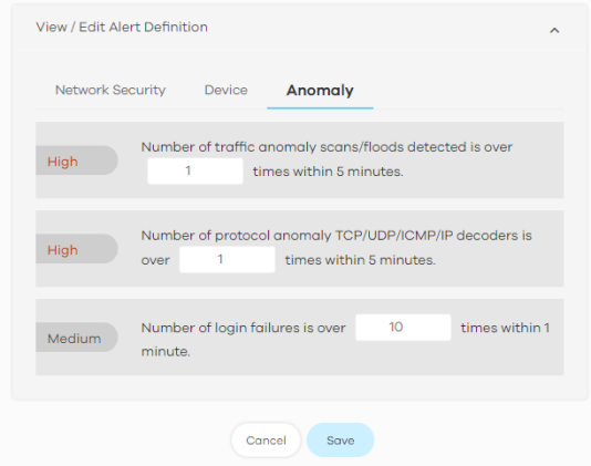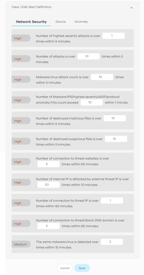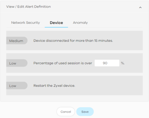 Percentage of used session is over % | The Zyxel Device has a limit on the number of concurrent active connections allowed. You can set a percentage threshold of this limit, and an alert will be sent if the number of connections exceeds this threshold. |
