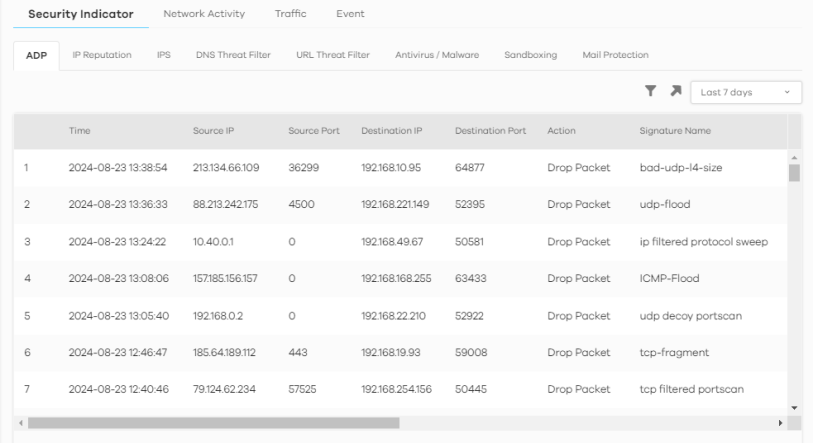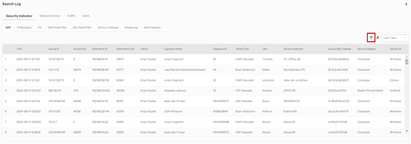 allow you to select a specific time frame to view. The default is the last 7 days. You can change the time frame depending on your license type, see Search > Log > Network Activity Screen for details.