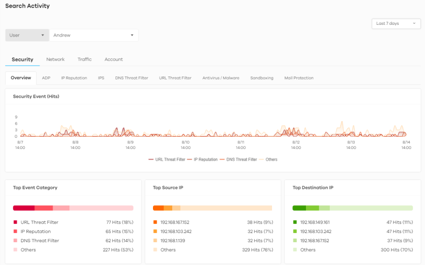 Click a graph to see further usage details for this user. The following figure shows details on security events through the selected Zyxel Device for this user.
