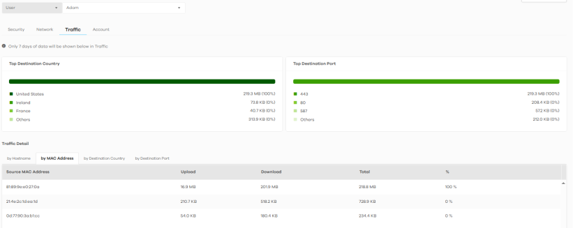 For a User, click Search > Activity > User > Traffic to display the following figure.