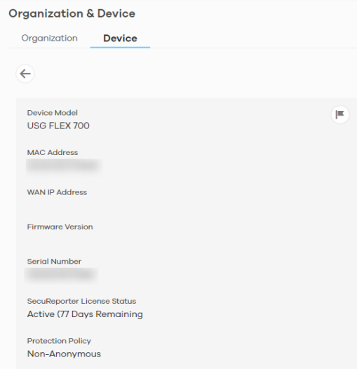 icon on the right when you hover the mouse on the registered Zyxel Devices that have activated SecuReporter licenses. This icon will not appear for registered Zyxel Devices that do not have activated SecuReporter license.