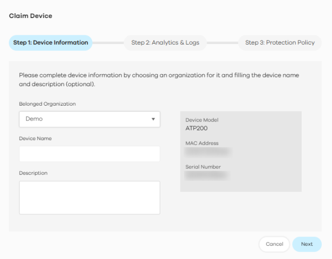 4 If this Zyxel Device was in SecuReporter before or if this is a replacement Zyxel Device for a Zyxel Device that was in SecuReporter before, then select Import Analytics & Logs from existing device; otherwise select This is a new device. Then click Next.
