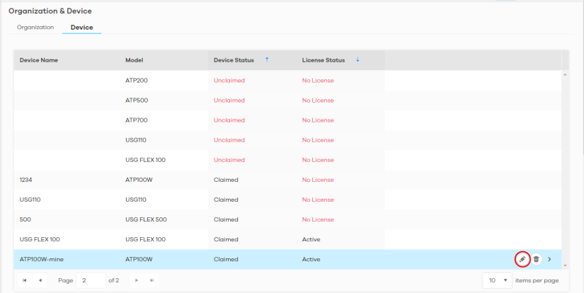 Claimed device displays the Zyxel Devices that have been added to this organization. Click the edit