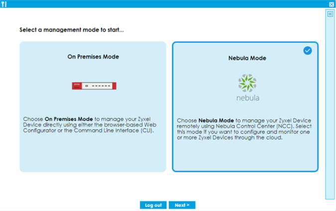 4 Log into the Zyxel Device. Run the wizard and choose Nebula Mode.