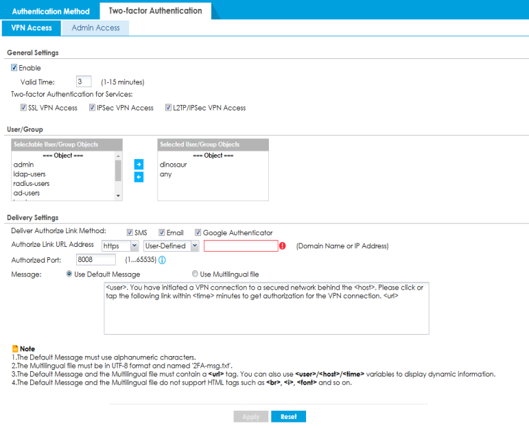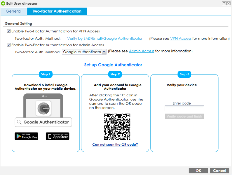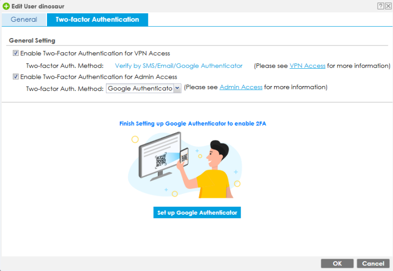 Enable Two-factor Authentication for VPN Access | Select this to require two-factor authentication for this user to use a pre-configured VPN tunnel for secure access to a network behind the Zyxel Device. Select the types of VPN allowed in Object > Auth. Method > Two-factor Authentication > VPN Access. You may choose from: • SSL VPN Access • IPSec VPN Access • L2TP/IPSec VPN Access |