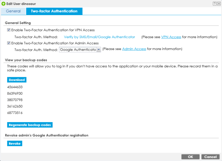 Revoke | Click this to cancel Google authentication as second-factor authentication for Admin Access. You must then use a PIN code by SMS or email as second-factor authentication instead. |