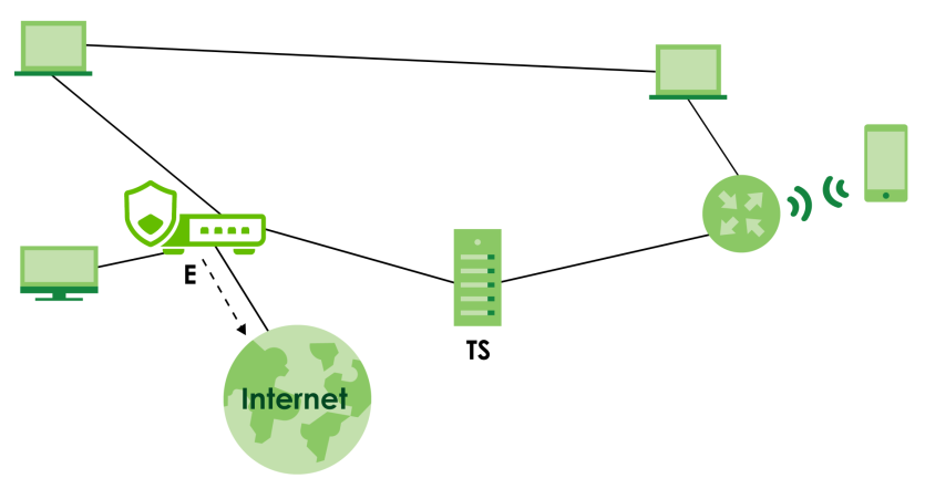 In the following figure, the Tailscale server (TS) creates a mesh network, allowing each client device to connect directly with others, resulting in lower latency. The Zyxel Device act as the exit node (E) to route the VPN traffic to the public Internet.