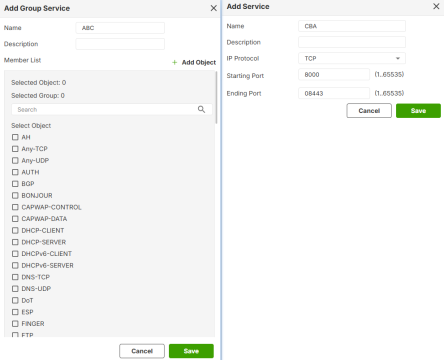 Select an object of IP address or service you created. To create an object, click Add Object.