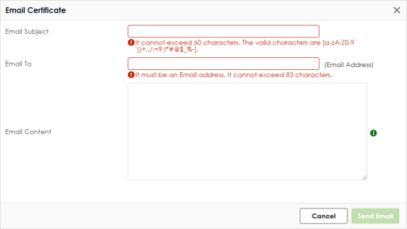 Email | Use this button to have the Zyxel Device send the selected certificate to a valid email address. Click a certificate’s row to select it and click Email to have the Zyxel Device mail that certificate. The following screen displays. ![]() |