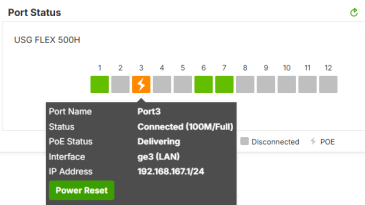 Click Power Reset to power off the PD connected to the port, by temporarily disabling then re-enabling PoE. This button only appears when the PoE port is connected to a PD.
