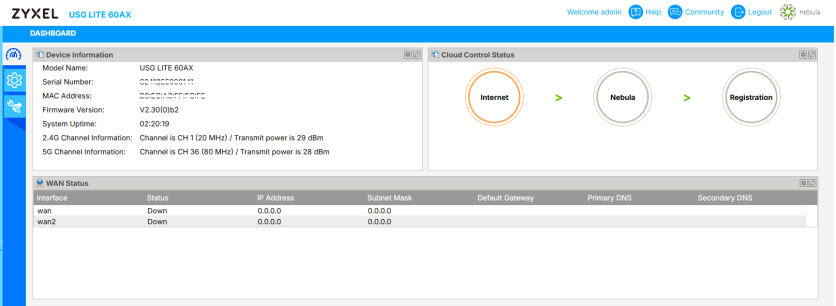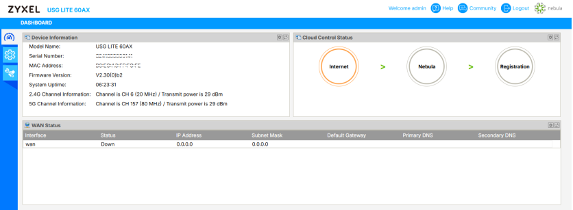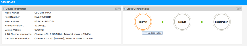 Cloud Control Status | This field displays: • The Zyxel Device Internet connection status. • The connection status between the Zyxel Device and NCC. • The Zyxel Device registration status on NCC. Mouse over the circles to display detailed information. To transfer your Zyxel Device management to NCC, first make sure your Zyxel Device is connected to the Internet. Then go to NCC and register your Zyxel Device. 1. Internet Green – The Zyxel Device is connected to the Internet through the WAN (default) or WAN2 interface. Orange – The Zyxel Device is not connected to the Internet. 2. Nebula Green – The Zyxel Device is connected to NCC. Gray – The Zyxel Device is not connected to NCC. 3. Registration Green – The Zyxel Device is registered on NCC. Gray – The Zyxel Device is not registered on NCC. |