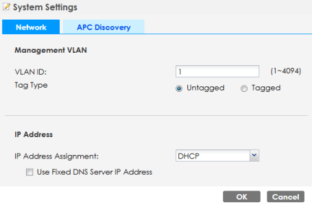 Manual | Select this option and enter the IP address of the APC manually. This is necessary when the APC is not in the same subnet and you want it to manage the Zyxel Device. |