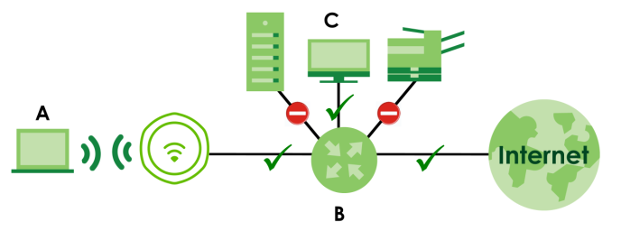 In the following example, layer-2 isolation is enabled on the Zyxel Device to allow a guest WiFi client (A) to access the main network router (B). The router provides access to the Internet and the network printer (C) while preventing the client from accessing other computers and servers on the network. The client can communicate with other WiFi clients only if Intra-BSS Traffic blocking is disabled.