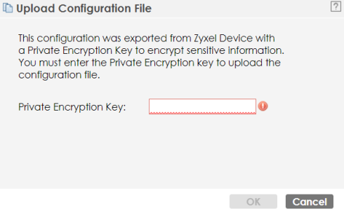 Upload Configuration File The bottom part of the screen allows you to upload a new or previously saved configuration file from your computer to your Zyxel Device. You cannot upload a configuration file named system-default.conf or lastgood.conf. If you upload startup-config.conf, it will replace the current configuration and immediately apply the new settings. | |