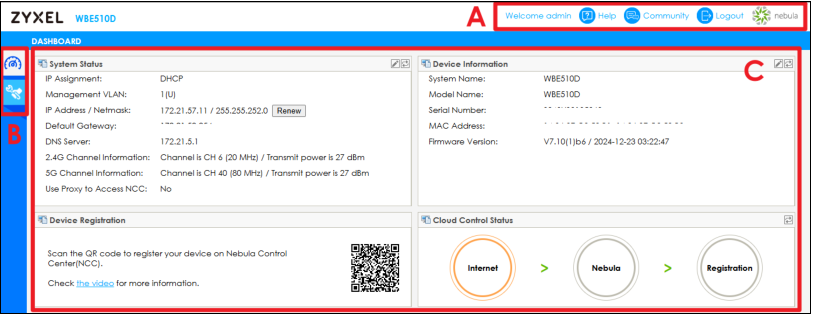The following summarizes how to navigate the Web Configurator from the Dashboard screen. The figures below show the Dashboard screen in standalone mode, cloud managed mode, and controller managed mode. The screen layout may differ slightly depending on the mode and device model.