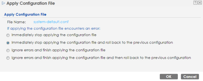 Apply | Use this button to have the Zyxel Device use a specific configuration file. Click a configuration file’s row to select it and click Apply to have the Zyxel Device use that configuration file. The Zyxel Device does not have to restart in order to use a different configuration file, although you will need to wait for a few minutes while the system reconfigures. The following screen gives you options for what the Zyxel Device is to do if it encounters an error in the configuration file. ![]() Immediately stop applying the configuration file - this is not recommended because it would leave the rest of the configuration blank. If the interfaces were not configured before the first error, the console port may be the only way to access the Zyxel Device. Immediately stop applying the configuration file and roll back to the previous configuration - this gets the Zyxel Device started with a fully valid configuration file as quickly as possible. Ignore errors and finish applying the configuration file - this applies the valid parts of the configuration file and generates error logs for all of the configuration file’s errors. This lets the Zyxel Device apply most of your configuration and you can refer to the logs for what to fix. Ignore errors and finish applying the configuration file and then roll back to the previous configuration - this applies the valid parts of the configuration file, generates error logs for all of the configuration file’s errors, and starts the Zyxel Device with a fully valid configuration file. Click OK to have the Zyxel Device start applying the configuration file or click Cancel to close the screen. |
