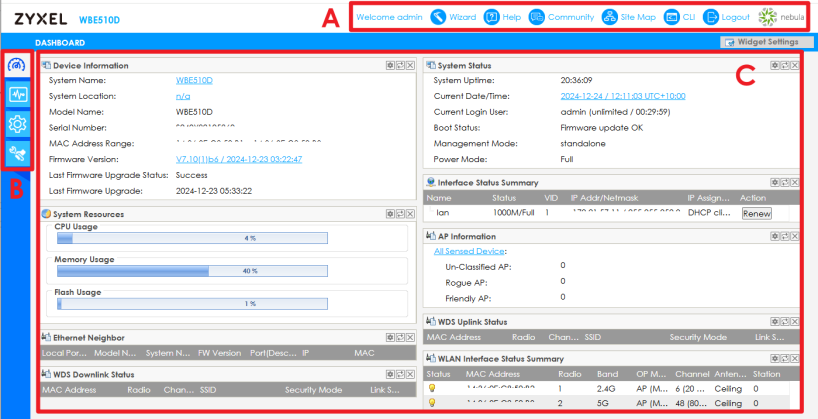 The following summarizes how to navigate the Web Configurator from the Dashboard screen. The figures below show the Dashboard screen in standalone mode, cloud managed mode, and controller managed mode. The screen layout may differ slightly depending on the mode and device model.