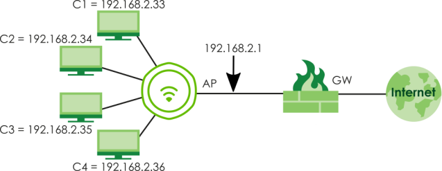 You can set Local bridge as the Forwarding mode of the Zyxel Device (Configuration > Object > AP Profile > SSID > SSID List > Add or Edit SSID Profile). This allows the connected WiFi client devices (C1 - C4) on the Zyxel Device (AP) to get individual IP address from the Gateway (GW) directly. Use this mode if you already have a gateway in your network.