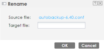 Rename | Use this button to change the label of a shell script file on the Zyxel Device. You cannot rename a shell script to the name of another shell script in the Zyxel Device. Click a shell script’s row to select it and click Rename to open the Rename File screen. Specify the new name for the shell script file. Use up to 25 characters (including a-zA-Z0-9;‘~!@#$%^&()_+[]{}’,.=-). Click OK to save the duplicate or click Cancel to close the screen without saving a duplicate of the configuration file. |