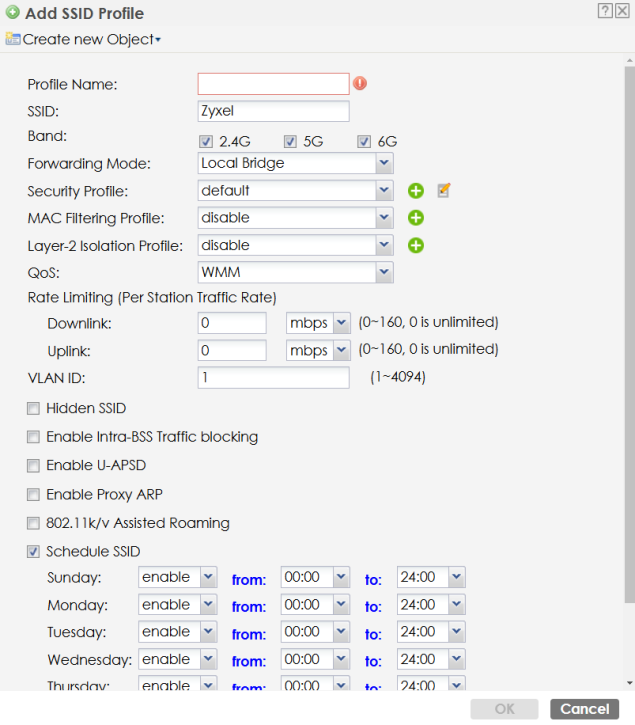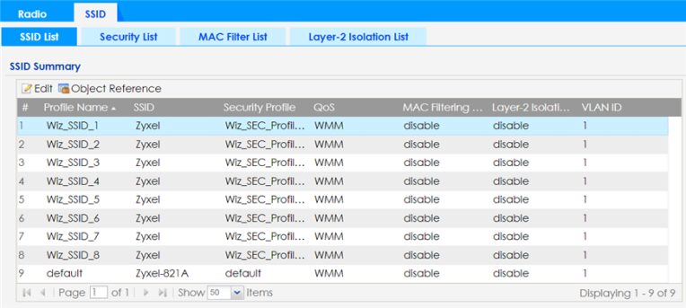 SSID - This profile type defines the properties of a single WiFi network signal broadcast by an AP. Each radio on a single AP can broadcast up to 8 SSIDs. You can have a maximum of 64 SSID profiles on the Zyxel Device.